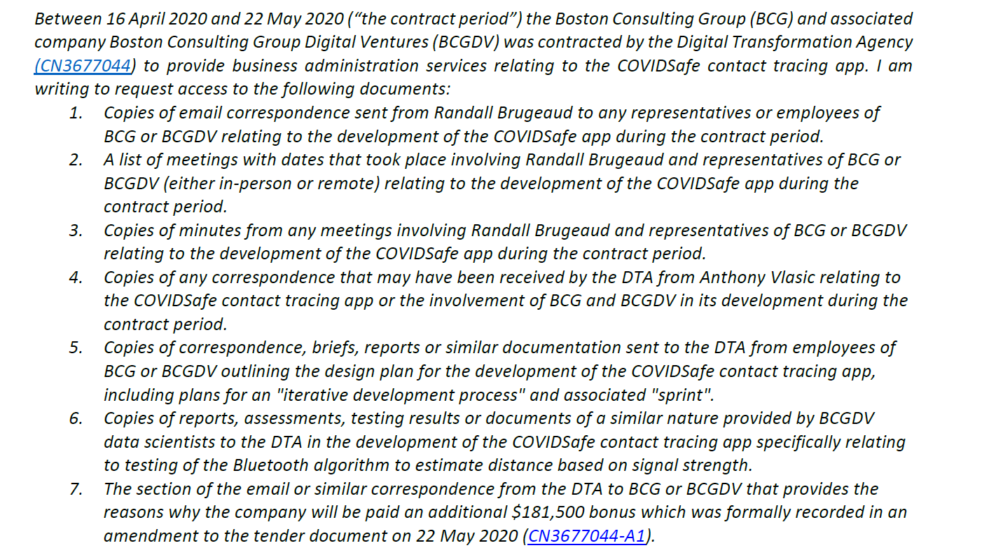 To be fair to the DTA, I had asked for a lot of material and I expected most searches would turn up nothing. Asking for any emails regarding COVIDSafe from Randall Brugeaud or Dr Anthony Vlasic was a longshot, as they likely had assistants and there were other, unnamed, points of contact who handled logistical matters. Still, the correspondence between the DTA and BCG promised to shed light on how and why critical decisions were made, either in the apps creation or when the company’s contract was extended. Item number six was also of particular interest for what it may reveal the level of understanding the developers had about the technology they were working with.