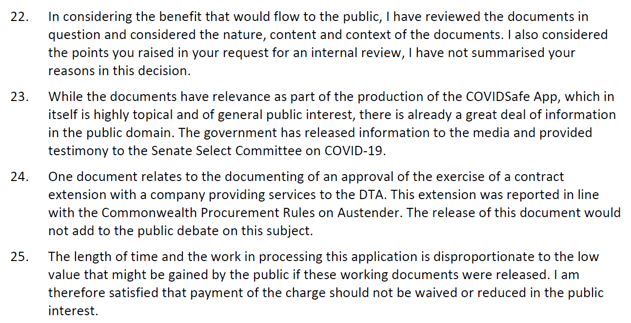 By this point I had already decided to push the whole thing to external review. That decision was not personal. It is a democratic right within Australia to have an executive decision of a government body checked in this way. Even if I was totally wrong about all of it, applying for a review to the Office of the Australian Information Commissioner (OAIC) offered a way to check the agency’s work and verify that yes, everything had been done correctly. If the OAIC came back and agreed with me, even better. That way, I’d get access to documents, a refund and hopefully another insight.