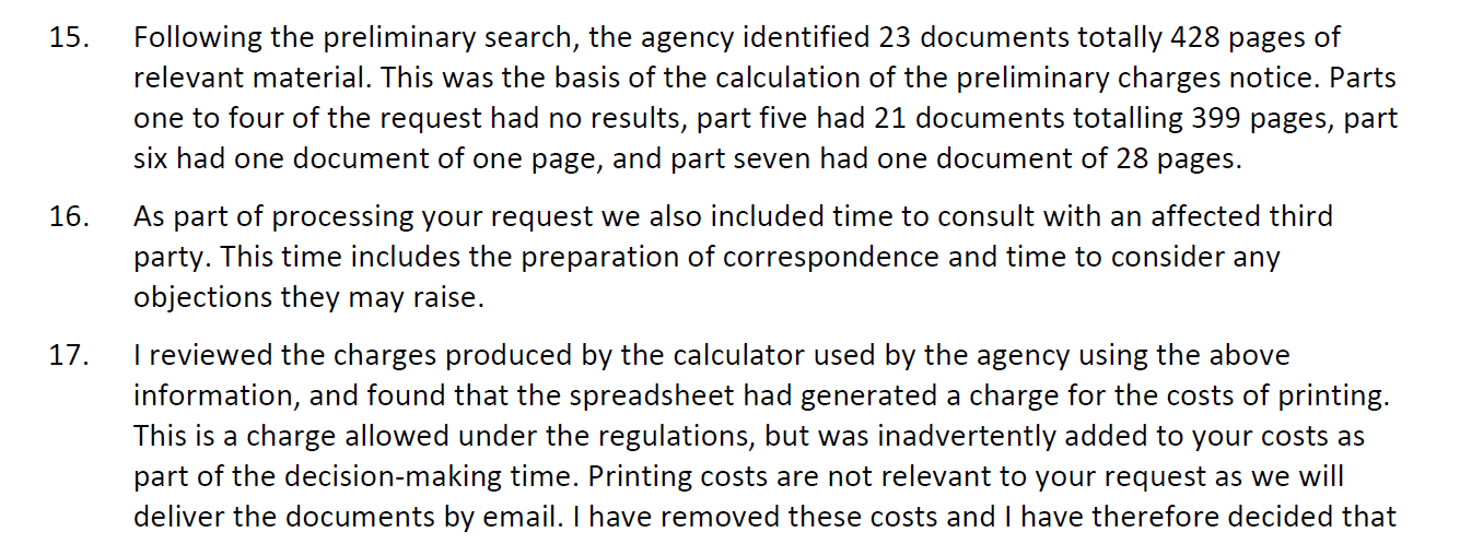 On top of this, there was another issue about deterrence. The high cost of the application on questions of clear public interest — a point acknowledged by the agency in their letters to me — could have been understood, whether real or merely perceived, as a deterrent to going through with the application. That was a problem. When considered against the number of documents released following the agency’s consultations with party’s unknown from BCG — Who exactly were the people? What was said during those consultations? How much weight was given to their input over mine? — it was a pattern that meant, as a reasonable person, I might be justified in thinking someone was taking the piss.