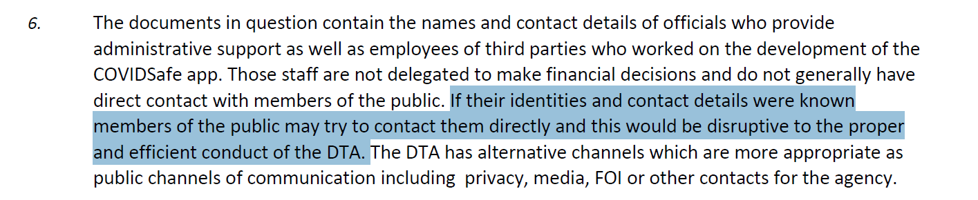 The decision letter went on to say the release of the names would do nothing to “improve the accountability of the DTA as none of the names are of staff with financial delegations or accountability for the production of any programs including COVIDSafe”.