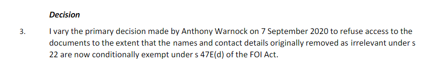 To justify the decision to redact names the decision maker cited Section 47E of the Act that allows an agency to refuse applications where it had a reasonable impact on their administrative functions. In this case, the decision maker had pointed to sub-section (d) — that says an application can be refused where it would have a “substantial adverse effect on the proper and efficient conduct of the operations of an agency”. The reason for this gave me a chuckle.