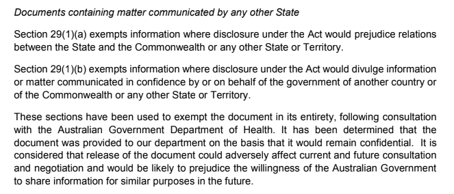 It was a similar story on the other application I put in with New South Wales Health. While Victoria and New South Wales both recognised the public interest in the documents, they refused to hand them over on the basis it may anger their federal counterparts.