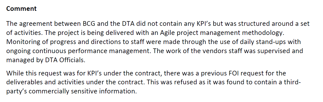 On 20 November 2020, however, I asked for a copy of the Key Performance Indicators (KPIs) or those parts of the contract with BCG that contained the KPIs, for work performed on the COVIDSafe contact tracing app. I did this for a couple of reasons. The first was to get a sense for what the companies who were contracted in had actually been required to do for their money. The second reason was tactical. If it was possible to identify the section of the contract that contained them, it may then be possible to argue that release of a portion of the document would not violate the confidentiality of the entire document.