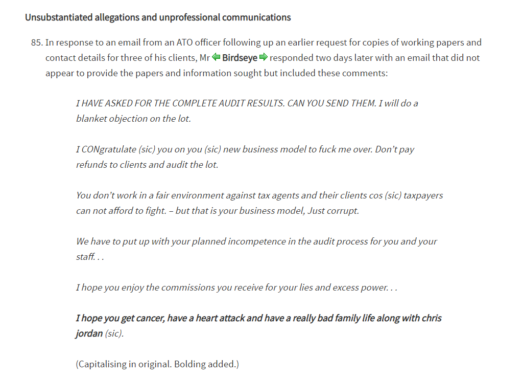 So much was going in 2020 that it was easy to miss the moment the federal court threw out an appeal by Adelaide tax accountant Nicholas Birdseye. Back in May 2020 the Administrative Appeals Tribunal upheld a decision to strip Nicholas Birdseye of his tax accountant registration. His crimes were various, but included a failure to pay $250,000 in taxes owed on three entities he managed, general financial chicanery and that time he wished cancer on ATO investigators in a late night email. When later confronted about it, Birdseye refused to apologise and had no regrets. The full email direct from the decision is submitted here for your approval: