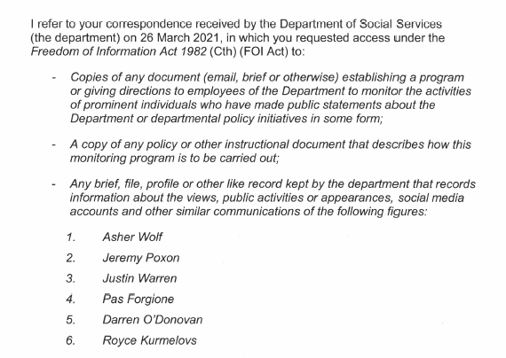 At least with regards to social security, there had been other whispers that something weird was going on. Another journalist Hannah Ryan, had attempted to find out through Freedom of Information (FOI) whether Services Australia was monitoring the accounts of activists who had organised in response to the illegal robodebt program and other social security issues. Her application did not go smoothly. Naturally, I figured I’d take a turn way back in March when I put in my own application for the following documents: