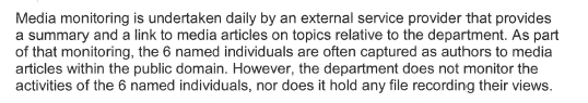 Ever since I have been wondering whether the department — or some other entity within the bureaucracy — has been responsible for running a media monitoring program for journalists and activists (hey, guys!). If so, it would hardly come as a surprise. Over in the US, the postal service was recently sprung as the administrators of a secret program that tracks and collects the social media posts of American citizens. Why not here?