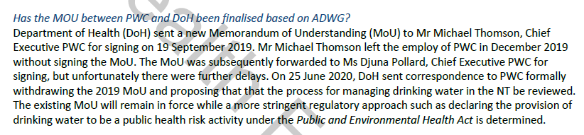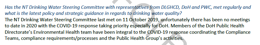 Now, when I tried to ask Health about whether the body had met, they repeatedly refused to answer any questions and directed the inquiry to another department. What they do reveal is that there seems to be a vague plan to pass new laws about drinking water quality standards, but so far NT Labor has been pretty hot and cold on the subject.