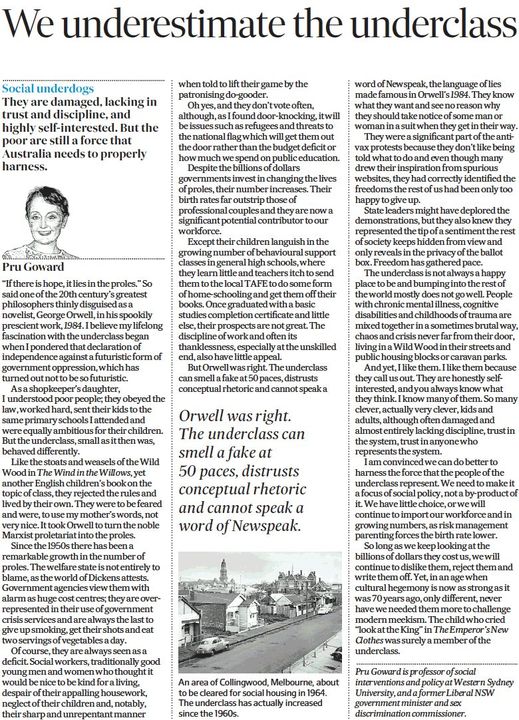 There are times when we here at Raising Hell struggle to find someone truly worthy of a Failing Upward nomination, but this fortnight was not one of them. We present to you the figure of Pru Goward, former New South Wales Liberal minister who in post-political life has pivoted into academia. Goward — who was also responsible for selling off public housing to make way for ritzy developments during her time in office — attempted to show her sympathy with "the proles” by publishing a column with the Australian Financial Review which met with immediate backlash. We won’t go into the specifics — you can read for yourself below — but all we’ll say is that it’s entirely what you expect to see when a member of the upper crust says the quiet part out loud.