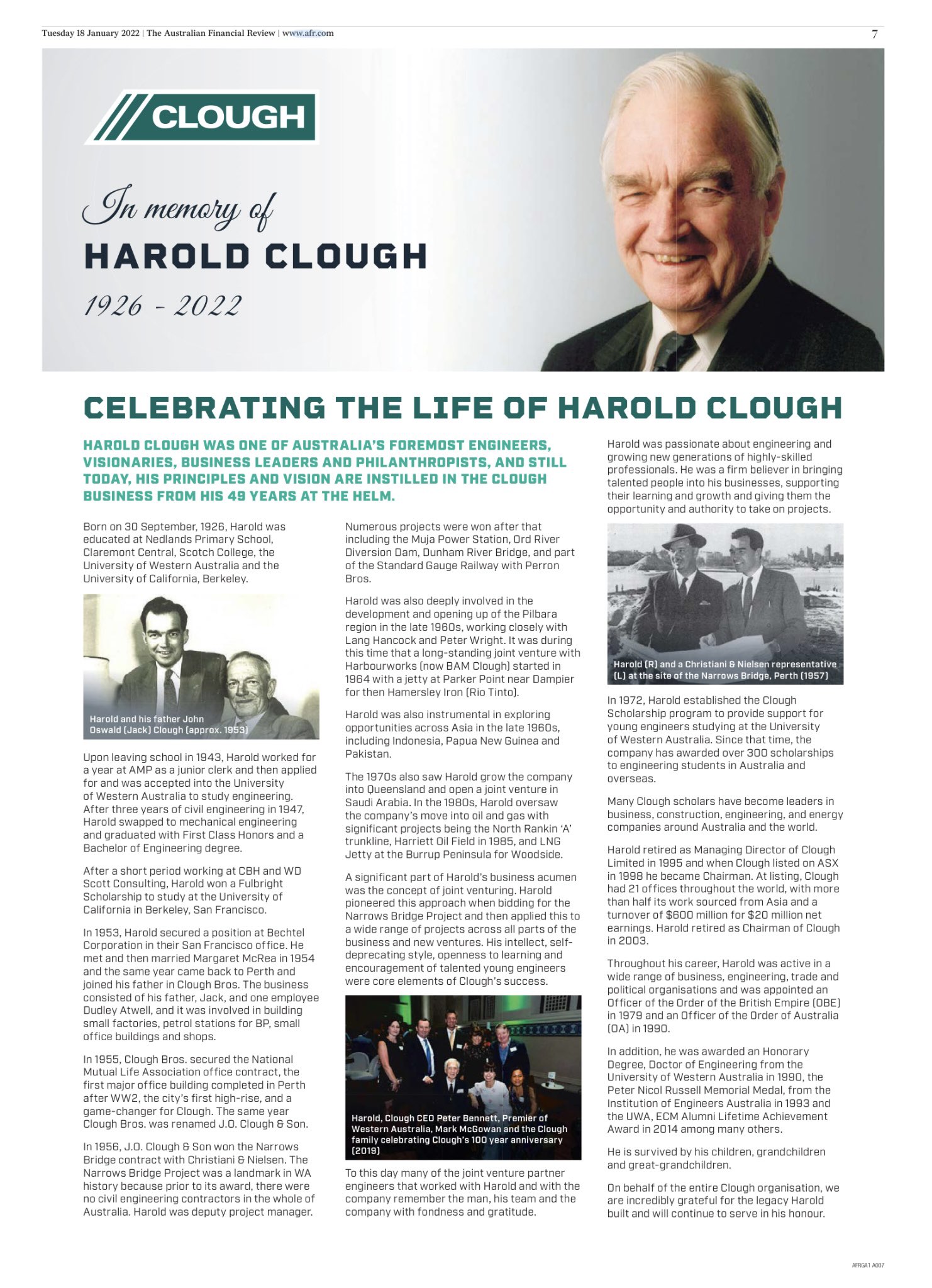 His death would first be marked by a full page advertisement taken out in the pages of the Australian Financial Review by his six surviving children to tell the story of how he made his fortune in the supply chain of the oil and gas sector. The spread would be accompanied by a photo showing Clough at a birthday party posing with both WA Labor Premier Mark McGowan and former Liberal Premier Colin Barnett: