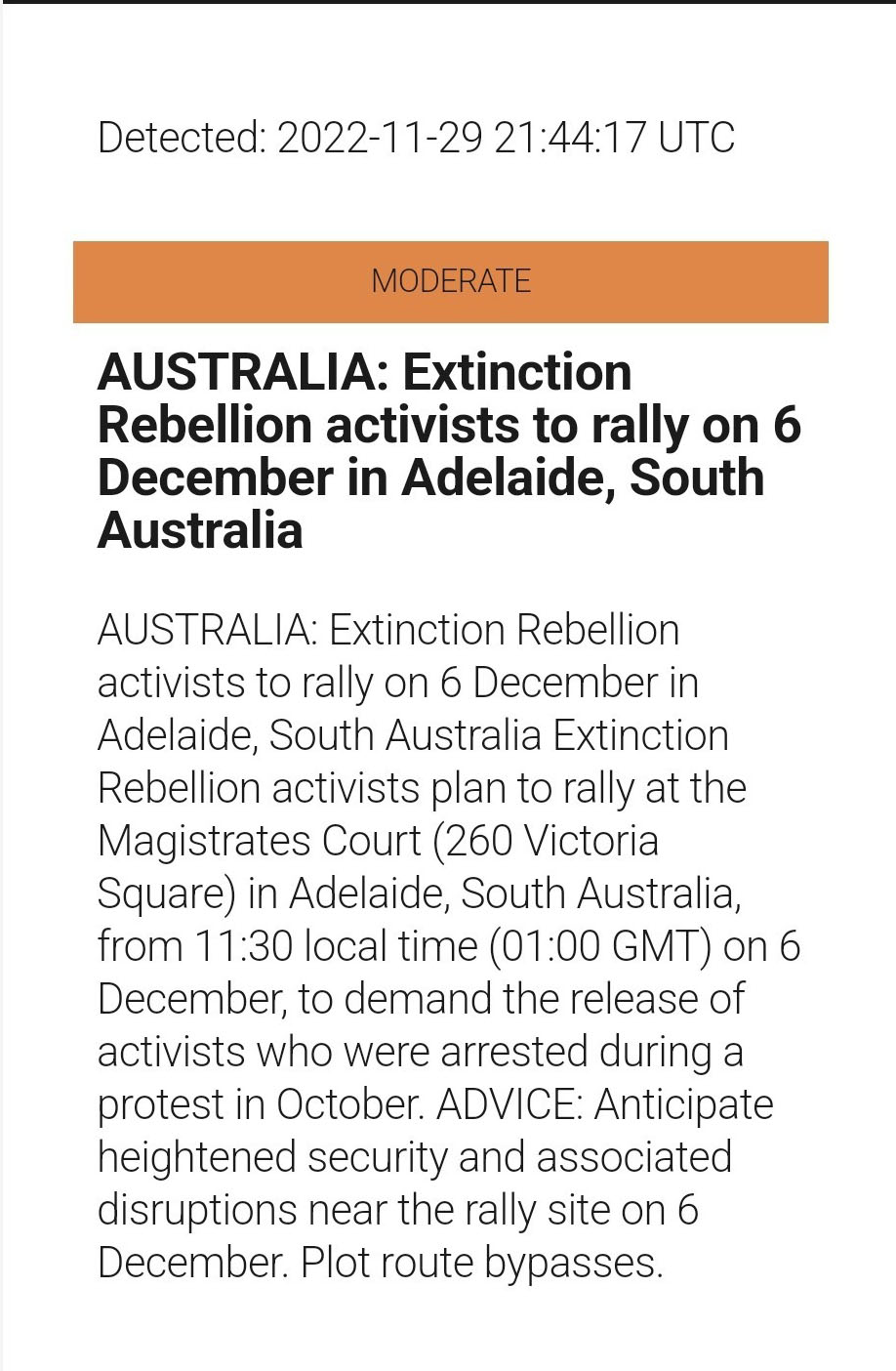 One such alert was sent out recently giving a warning about the South Australian branch of Extinction Rebellion who announced support rallies on Facebook for the 13 activists scooped up by police while protesting an oil and gas conference in October (see Issue 62). What, on the spectrum of protest actions, is a pretty routine and tame affair was recontextualised by Crisis24 and spat out through World Travel Protection’s alert system as “moderate” risk to those travelling to Adelaide: