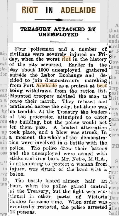 The curious thing is that nothing Extinction Rebellion has done comes close to one of the most disruptive protests in Adelaide’s history. Back in 1931, when there was no social security system, the government attempted to cut the “mutton ration” it provided to the unemployed during the Great Depression. In response, a thousand unemployed men, their families and their supports marched from Port Adelaide to the Treasury building on King William Street to meet with the Labor Premier at the time, Lionel Hill. When they arrived, the crowd was ambushed. Mounted police and those on motorcycles charged the crowd, a brawl erupted with those gathered fighting to protect the women and children in the crowd. The fight spread out over Victoria Square and lasted half an hour.