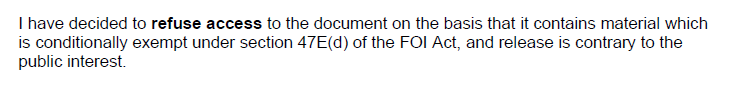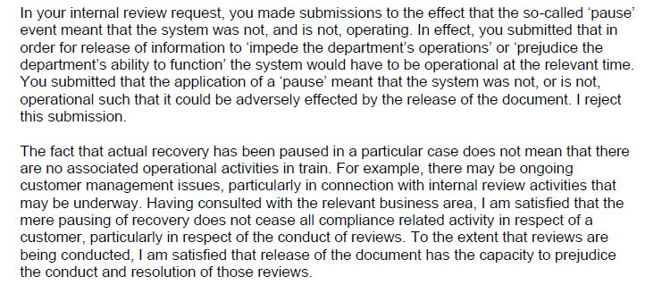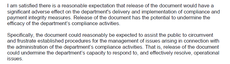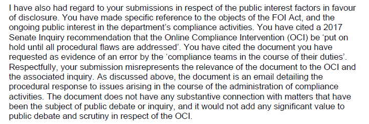 My favourite bit was where Thomas bolded the words “refuse access”. For what it’s worth, s47E(d) holds that “a document is conditionally exempt if its disclosure under this Act would, or could reasonably be expected to […] have a substantial adverse effect on the proper and efficient conduct of the operations of an agency.” In a longer explanation for his decision, Thomas explained how he thought releasing the documents might help people “circumvent” the department’s debt collection activities: