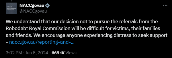 Whether or not APSC could actually, meaningfully pursue and sanction those public servants who retired either remains to be seen — but the NACC was not done. Aware that the impact was coming, the institution braced itself. The social media post that carried its statement to the public further advised readers that: “we understand that our decision not to pursue the referrals from the Robodebt Royal Commission will be difficult for victims, their families and friends.” The same post linked out to a page on NACC’s website that included a series of links to support services, first among which was Lifeline, the suicide crisis-help hotline. Comments on the post were turned off.