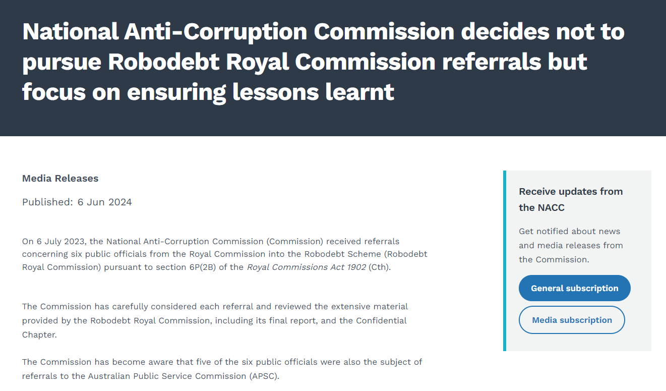 But circumstance means I’ll be putting this off until a little later to address something more pressing: the decision by the National Anti-Corruption Commission (NACC) to not pursue an investigation against six public servants over their role in creating, facilitating and then covering up the Robodebt scandal, and the subsequent decision by NACC Inspector Gail Furness to investigate the decision not to proceed.