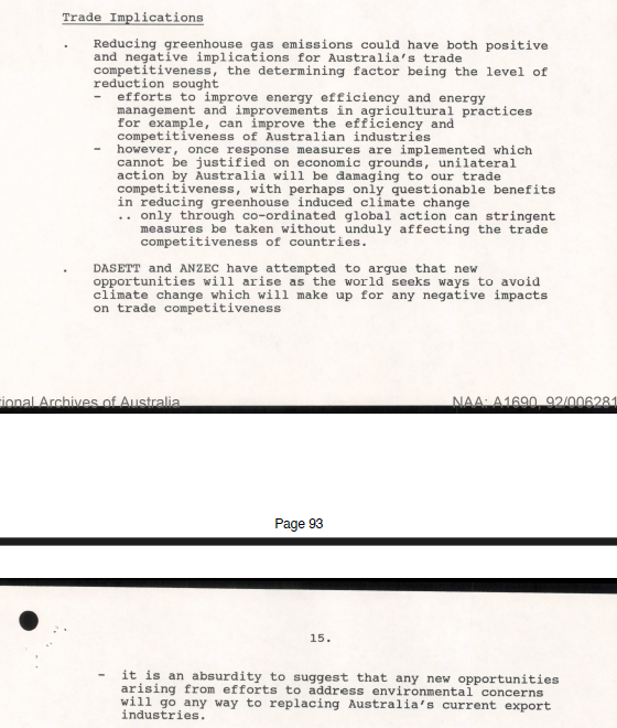 To give a little context: the documents record briefings the Department of Primary Industry and Energy (DPIE) were giving their minister ahead of cabinet meetings to decide the implementation of emissions reduction targets. DPIE, plainly, were against the idea, and were especially against any sort of interim targets being implemented while everyone argued over whether the official ones should be stood up. What is notable is the extent to which, even then, they were relying on the kind of sophisticated climate denial that is easy to spot today—not arguing about whether the threat exists, only arguing about how best to get there. The second thing to keep how government department's like DPIE function. Think of any government department as funnel into which the thoughts, feelings, facts and preferences of its constituency pour like raw crude. Out the other end flows a golden, honeyed petroleum ready to be ignited by the minister in the confidential sanctity of the cabinet room. In DPIE's cases, its constituency were those owned the country's coal mines, oil pumps, offshore gas rigs, refineries, smelters and factories.