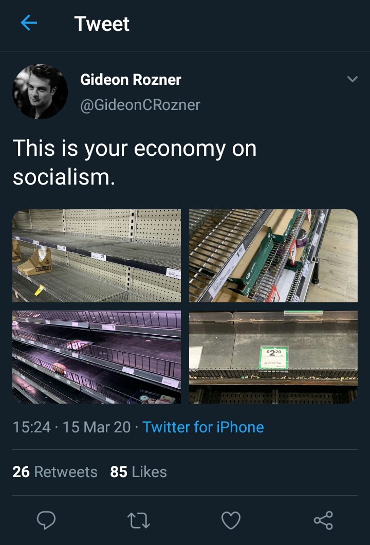 This fortnight we recognise Gideon Rozner, the director of policy at the small-government, libertarian think tank The Institute of Public Affairs. In one tweet Rozner posted images of bare supermarket shelves with the insightful comment: “This is your economy on socialism”.