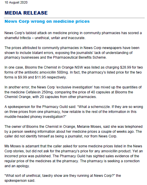 News Corp have played an ignominious role in helping to bring about what is perhaps the first press release worth printing in full and without qualification after the Australian Pharmacy Guild called out a painful instance of gotcha journalism, concluding with a simple question: “What sort of unethical, tawdry show are they running at News Corp?”