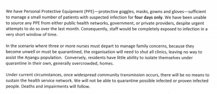 If that sounds like I was given the run-around, that’s because I was. To be fair, SA Health’s media team did quietly apologise for, essentially, handballing public health questions relating to a vulnerable community to anyone else during an emergency. In the end, it took a full week of sustained questioning to get answers, but the following Monday I was eventually sent a four line statement. The communique included additional background explaining that, as of that day, additional personal protective equipment was on route to medical organisations in the APY Lands — weeks after medical authorities in the region had written to the ministers (in early March) saying they only had enough equipment to handle a small outbreak for four days. Here’s an excerpt from that letter:
