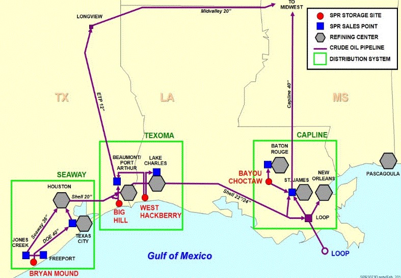 Map of the US Strategic Petroleum Reserve circa 2018 (Source: Wikimedia commons)