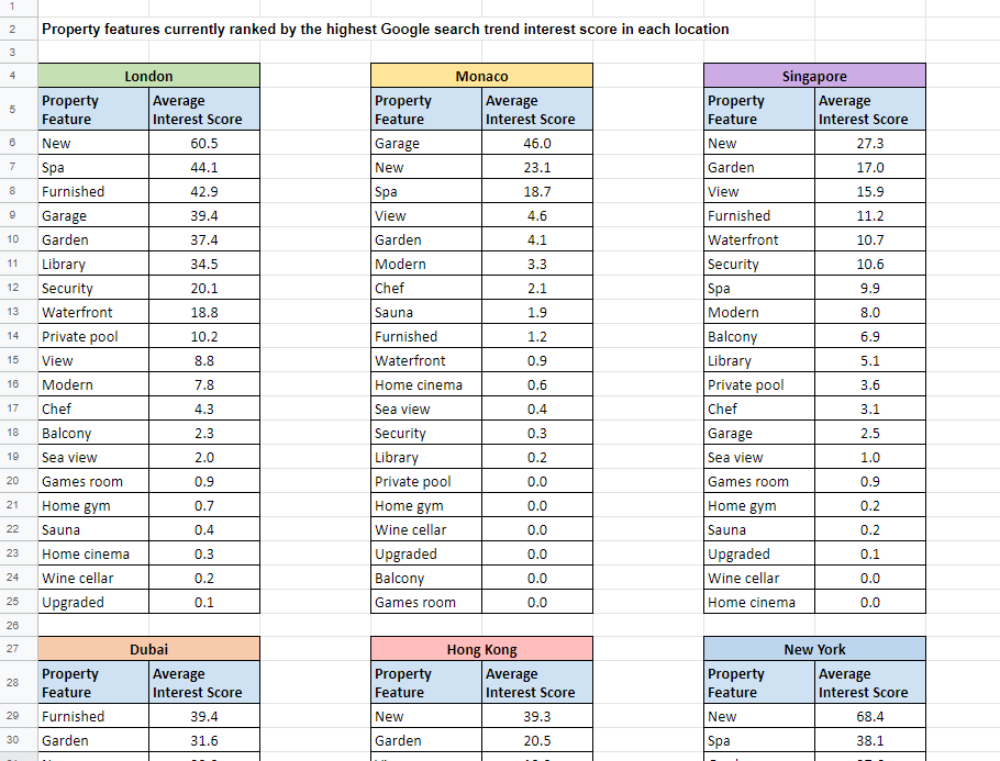 If you were ever wondering what the world’s richest look for in a home, wonder no longer! In the relentless quest to drive retail sales up, up, up, the fine fellas at Enness Global have scoured Google Search Trends to find out what the world’s super-rich (or apparently those who aren’t rich enough to stop using Google) actually want in a luxury home, list them in a spread sheet and group them by the world’s six largest financial hubs. Curiously “security” was a concern everywhere except Monaco and Hong Kong…