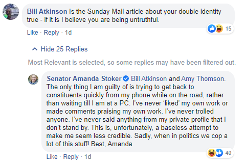 This time around, she was caught out in a far more meaningless scandal by no less than the Courier Mail who noticed the ever-present figure of “Mandy” in the comments threads of the senator’s official Facebook page. Mandy —Amanda… whoever, routinely used the second account to act as her own hype man, “liking” her own posts, referring to herself in third person, shouting down her critics and suggesting more support for her ideas than there might otherwise be.