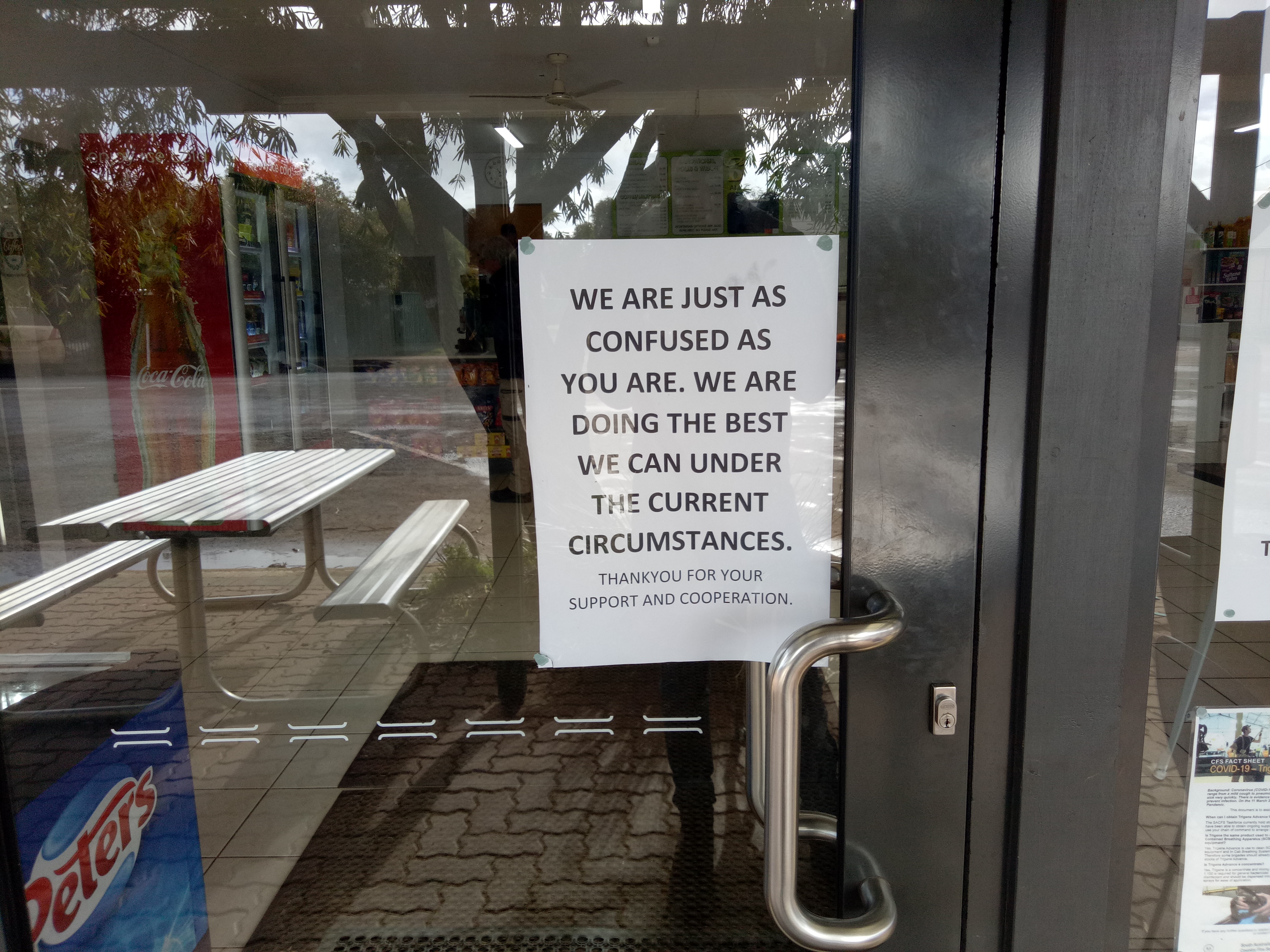 Image: For anyone who thinks the outrage and “confusion” in the first week of the pandemic was limited to Twitter, here is the sign on the door of Davo’s Deli in Parndana, Kangaroo Island which still hangs in late June 2020. (Source: Royce Kurmelovs).